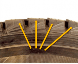 Los canales del dibujo de los neumáticos, encargados de drenar el agua, presentan este peculiar desgaste, debido al mal estado de los amortiguadores.