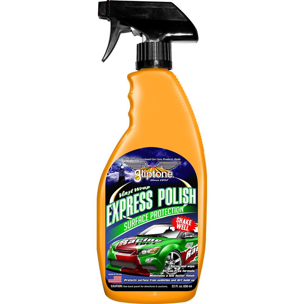22oz. EXPRESS POLISH VINYL WRAP & FLAT 22oz , brillo para vinil. Protección de superficie. Excelente para envoltura de vinilo y vehículos pintados con primer. La fórmula limpia, acondiciona y protege suavemente la superficie contra los dañinos UV, detergentes agresivos y contaminantes ambientales mientras mantiene un acabado rico, antideslumbrante y de bajo brillo. De grado profesional sin vetas, fórmula “rociar y retirar” que respalda el proceso de lavado eliminando la suciedad y los residuos de insectos de un lavado de autos básico y dejando una protección residual para proteger contra la decoloración el agrietamiento y el daño de contaminantes ambientales.